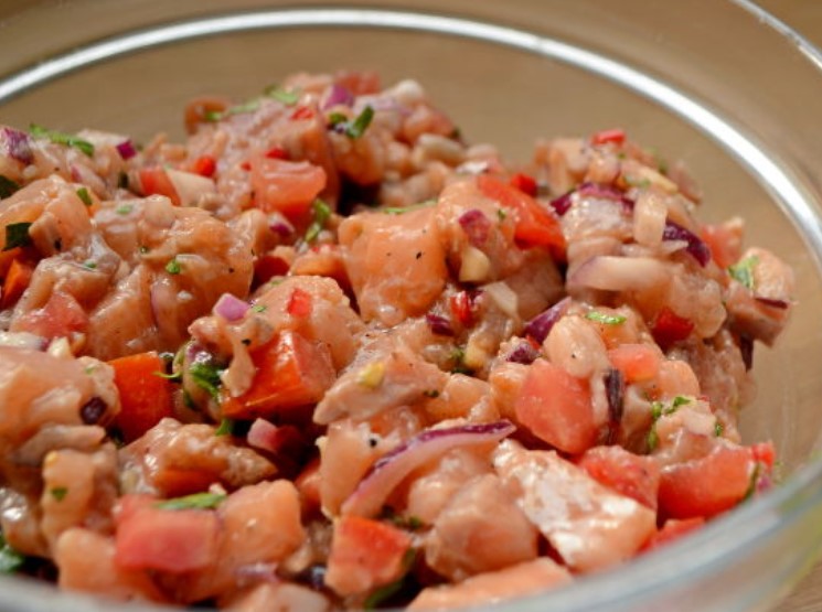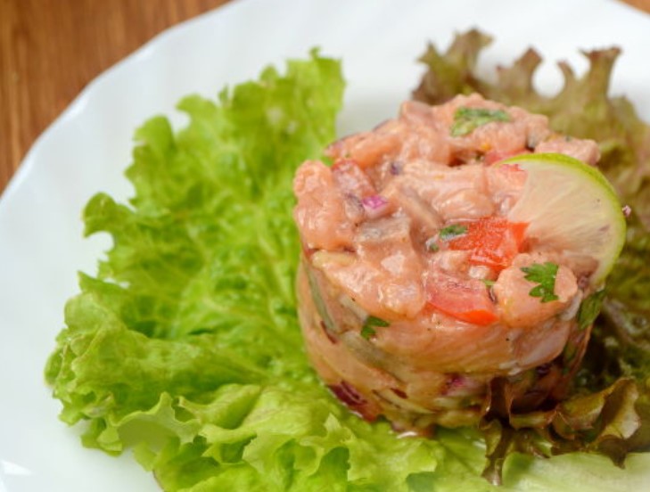 Ceviche is a raw fish snack common in Latin American countries. Many cuisines adapt this dish to their national traditions. Salmon ceviche marinated in lime juice acquires a Mexican flavor thanks to cumin, cilantro and red pepper.