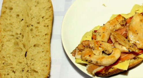 - Grease the other half of the ciabatta with mayonnaise, cover the sandwich and cut it in two. The chicken sandwich is ready.