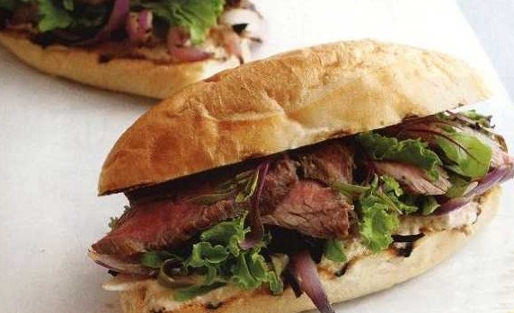 Cut the base tails from the onion slices. Cut the steak into strips. Place the meat, onion and lettuce between the buns. Serve the sandwiches immediately.