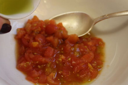 Add a little olive oil, salt, and pepper to taste into chopped peeled tomatoes.