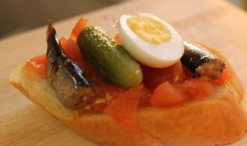 Carefully lay the tomato mixture on the slices of the loaf, let it soak a little into the loaf. Then put on each slice of bread one or two fish, gherkin, and half an egg.