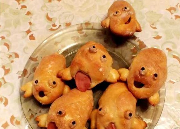 An interesting recipe for sausages in the dough, to the preparation of which you can safely involve children. Yeast dough is made in a bread machine.