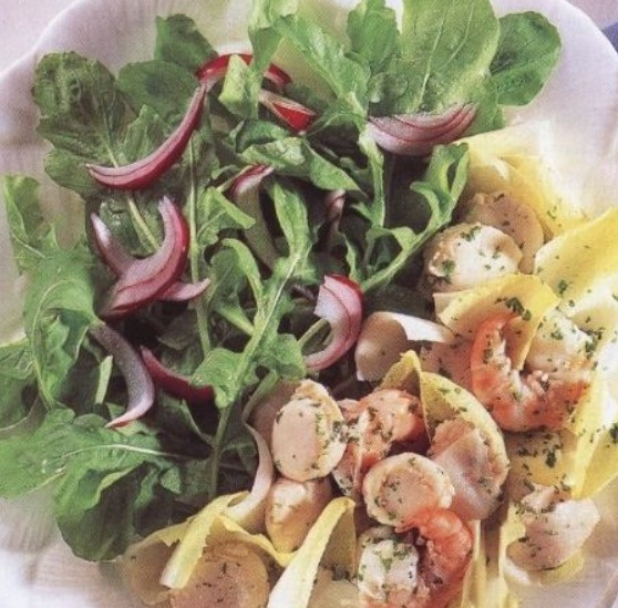 And just before serving, add chicory and parsley to the seafood. Mix well. Serve with arugula and red onion (optional).