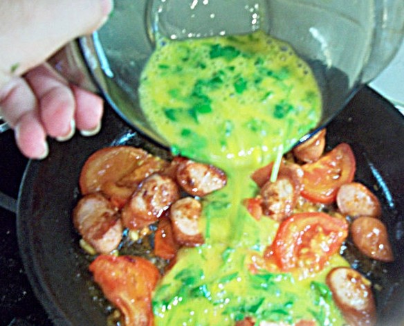 Pour the resulting egg mass into everything in the pan, cover the eggs with sausages and tomatoes with a lid, and over a tiny fire for a couple of minutes.