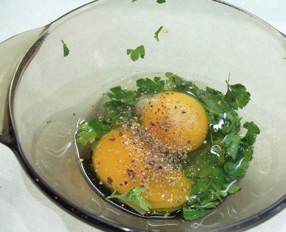 Cook everything together for about 1 minute. And during this time, break the eggs into a bowl, add washed and chopped parsley, add salt. Whisk everything with a fork.