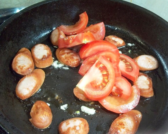 Peel the garlic, wash and chop finely with a knife. When the sausages are golden, send the chopped garlic to them. Wash the tomatoes, cut them into half rings, and put them in the pan immediately.