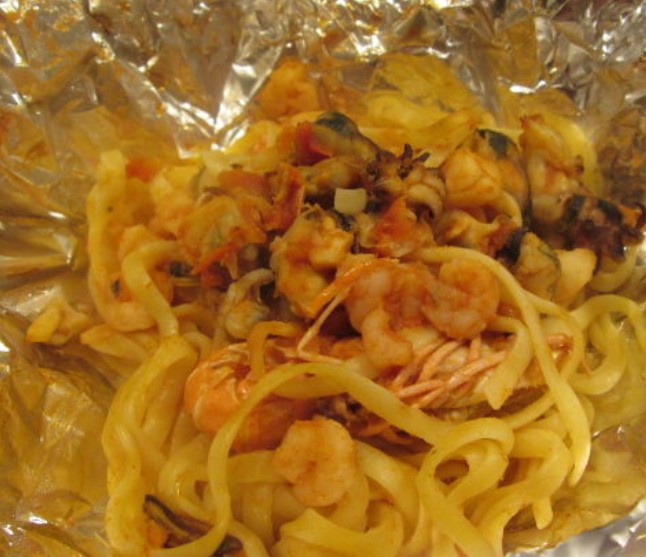 We serve pasta with seafood in foil – each guest will unwrap his own bag!