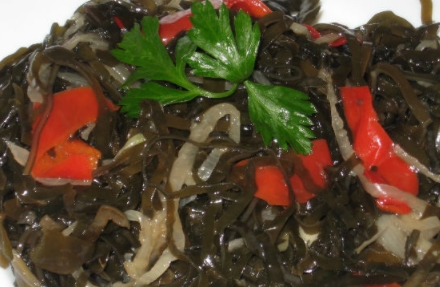 To replenish the iodine supply in the body and eat, prepare a seaweed salad. The recipe suggests dry seaweed, but if you have canned, then take it 3-4 times more and, of course, do not boil or soak. 🙂