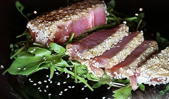 Fry the tuna steak in a pan. I use a grill pan, but it doesn’t really matter. It is important to fry it for 1 minute on each side over a slightly above medium heat so that at the end of cooking, the steak in the middle is still raw. Then it will be as tasty as possible! When preparing tuna steak, the main thing to remember is the rule: 2 minutes of marinating, 2 minutes of cooking. What could be easier! Serve the tuna steak on the table, garnish the plate with arugula. Enjoy your meal!