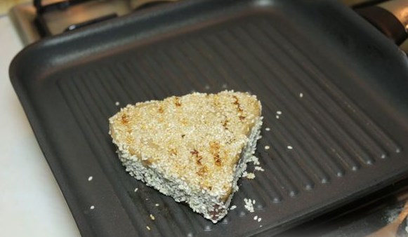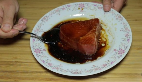 Dip the tuna steak into the marinade. We make it so that it covers the entire surface of the steak. Let the steak marinate for 1 minute. After that, pour the marinade over the steak using a teaspoon and leave for another 1 minute. The fish readily absorbs soy sauce and changes its color before our eyes, so marinating it for 2 minutes is enough.