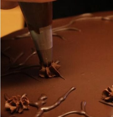 Put the whipped ganache in a pastry bag with a toothed nozzle and place the flowers on the chocolate cake.