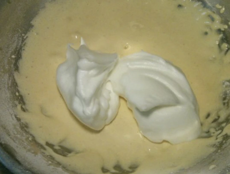Add some of the whipped whites to the yolk mass and stir gently from top to bottom. Add the rest of the proteins and stir slowly until smooth.