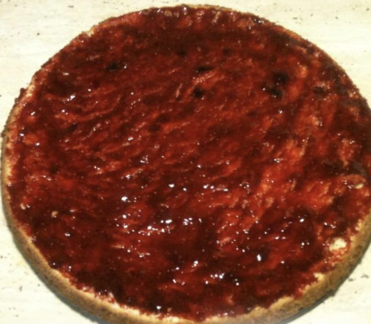 Layer the cake layer with thick strawberry jam and top with a second biscuit cake layer.