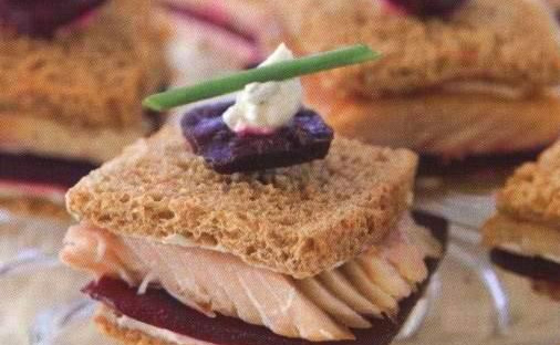 Spread a thin layer of cheese mixture on a square of bread. Spread the trout and beets evenly on top; cover with another square. Garnish with beets and onions.