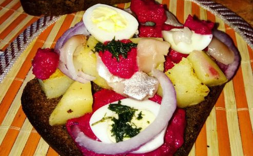 We collect smorrebrod. We spread the herring, potatoes, onions at random on slices of bread, add beetroot sauce and halves of an egg. Decorate the herring sandwich with fresh dill.