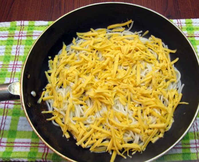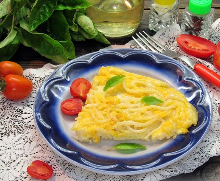 Boiled spaghetti and hard cheese serve as an excellent addition to an omelet, making a regular breakfast more satisfying and interesting. An omelet with macaroni and cheese is prepared very quickly and easily – in a pan.