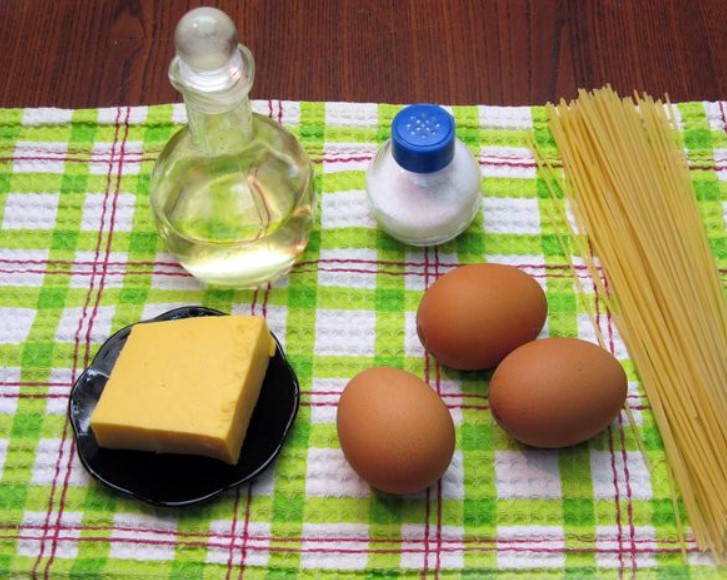 Essential products. Spaghetti for such an omelet can be boiled in advance or you can use pasta that remained after cooking other dishes.