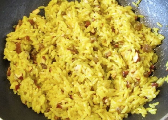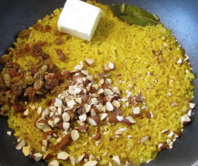 - Add nuts, squeezed raisins, and butter to hot rice. (Butter can be omitted or reduced.)