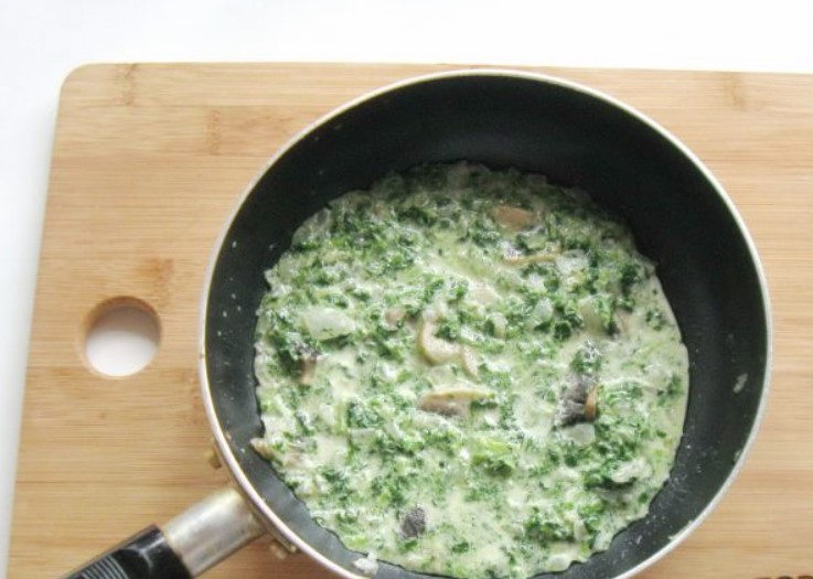Simmer spinach with mushrooms, onions, garlic and cream for 3-4 minutes and turn off.