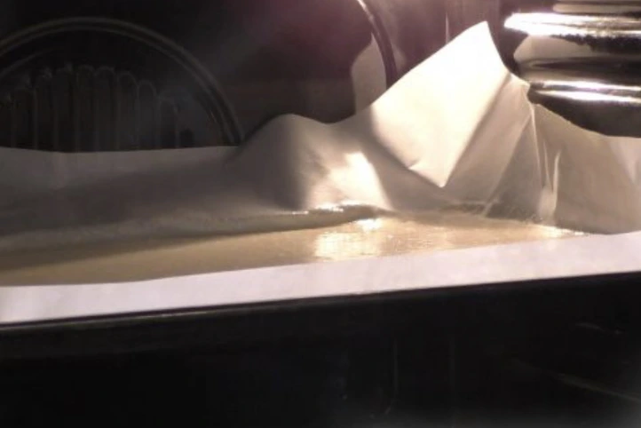 Remove the finished cake from the oven, transfer it to a clean sheet of parchment paper, and remove the paper on which it was baked from the biscuit.