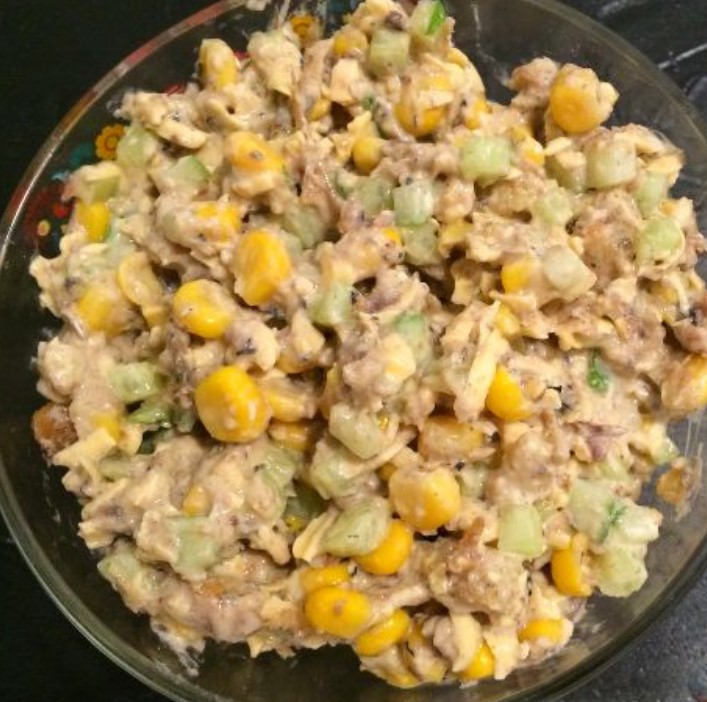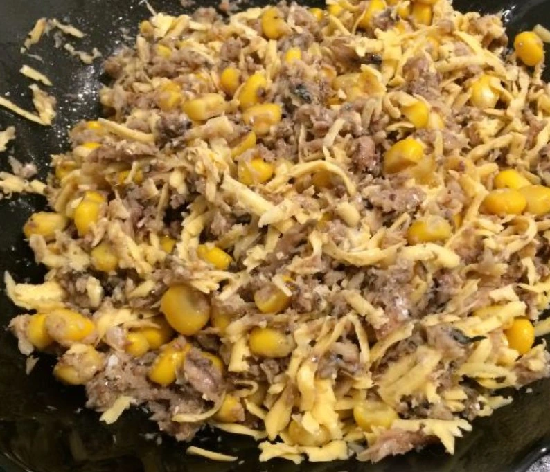 Grate the cheese on a coarse grater and add to the salad with corn and sprats.
