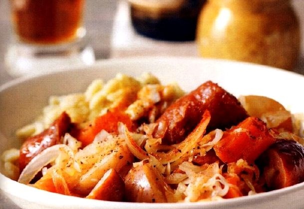 Here is such an unusual stew of fresh vegetables, sauerkraut, and sausages is prepared with a beer in a slow cooker (slow cooker).