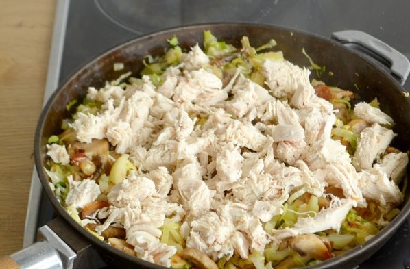 Add the chicken fillet to the skillet with onions, mushrooms, and cabbage.