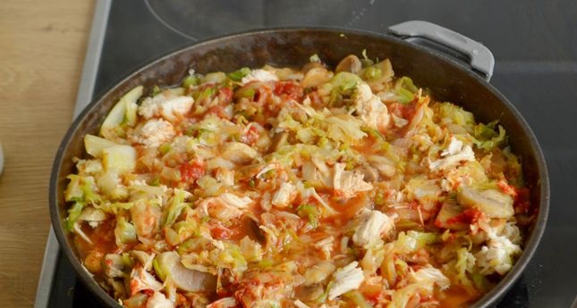 Stewed Cabbage with Mushrooms and Chicken, in Tomato Sauce