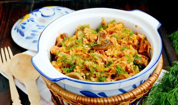 Stewed cabbage with mushrooms, chicken, and fresh dill goes especially well with a slice of black rye bread, be sure to try it!