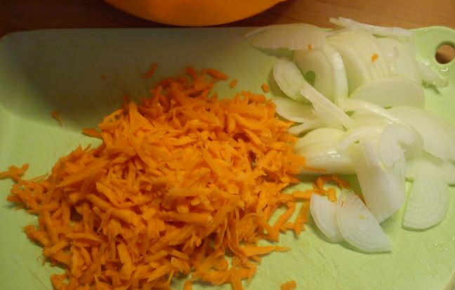 We wash my legs, let them drain. After pickling in spices, add salt and pepper. Cut the peeled potatoes into cubes. Separately, three carrots on a coarse grater and finely chop the onion.