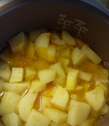 We turn on the multicooker, set the “fry” mode. At the bottom we pour 2 tablespoon. tablespoons of oil, send onions and carrots there, fry until semi-golden. Add chicken and fry for 5 minutes. Then we turn on the “Stew” mode, set the time – 40 minutes, add potatoes, pour water, close the lid.