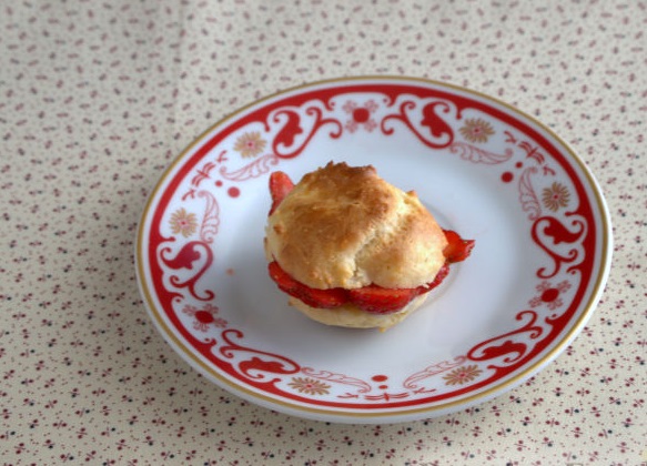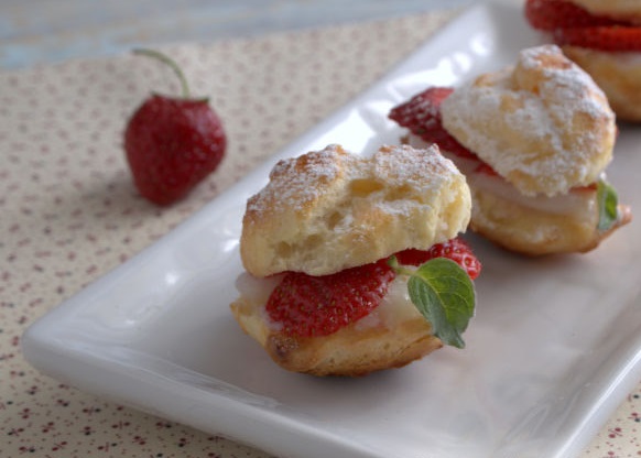 Cut the strawberries into 3-4 pieces, put the berries in custard cakes with cream.