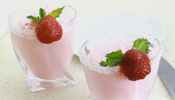 - Pour strawberry smoothies into glasses. Decorate with strawberries and mint. Strawberry smoothie is ready!
