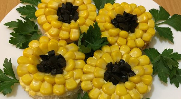 Sunflowers sandwiches with corn and olives are a festive snack that will decorate any meal.