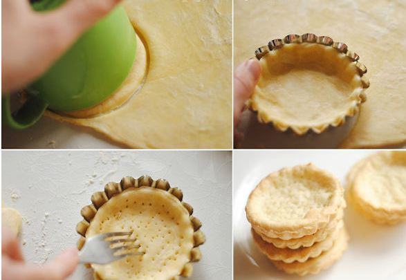 Sprinkle flour on the table and rolling pin and roll out the dough into a layer about 2-3 mm thick. Cut out the circles for the molds. If you have something of a suitable dia (i.e. slightly larger than the dia of the tartlet molds), such as a cup, you can cut out circles with it. If not, before rolling out the dough for tartlets, divide it into 12 equal parts, and roll them out already. We spread the dough into molds, pressing down the edges well so that there are no air pockets left anywhere. Do not forget to prick the dough with a fork. And we bake the tartlets in the oven at 200 degrees for 15 minutes. We set aside to cool.