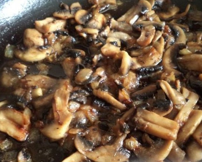 Put the mushrooms on the onion. Simmer everything together, stirring occasionally, for about 5 minutes. Salt, add spices as desired. Mix.