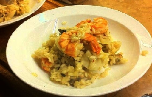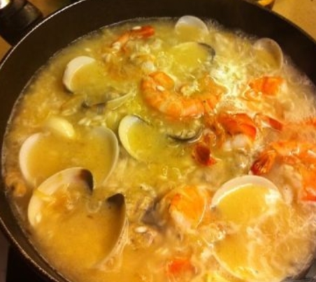 - Load into a frying pan with rice seafood, chili, pour in the wine, salt, pepper, mix, cover and cook until the liquid evaporates.