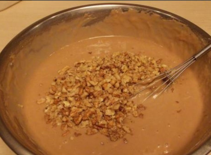 Now it’s time for the flour. Pour in parts and knead the dough. It should turn out to be thick and viscous, but you do not need to clog it with flour. Pour lightly chopped walnuts into the dough.