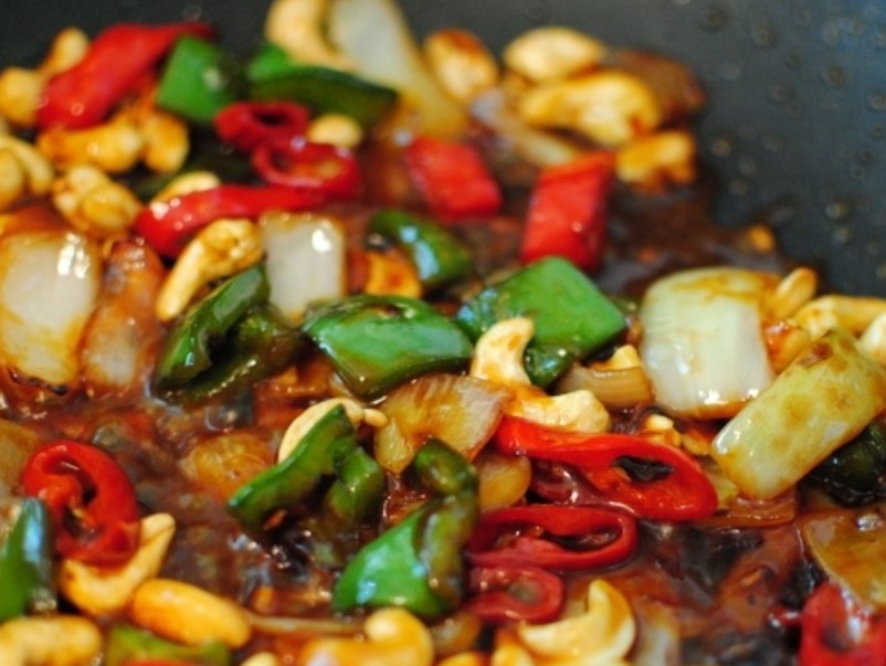 Add cashews and fry together for a minute.