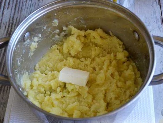 Also, to the still warm potatoes, grate melted cheese on a coarse grater.