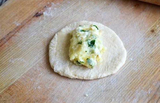 Roll out the dough pieces into small cakes. Put 1 tablespoon of the filling in the center.