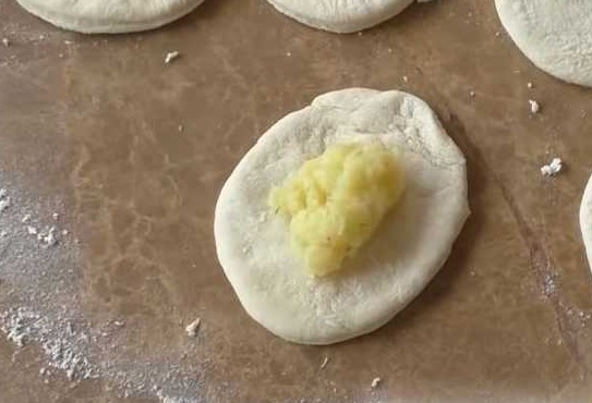 Put a teaspoon of potato filling on a circle of dough.