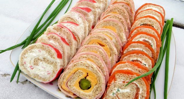 The third roll is made from ham. When all the food is prepared in advance, it comes out quickly. For this role, I rolled up the edges of the bread in advance – it is more convenient to form a roll.