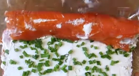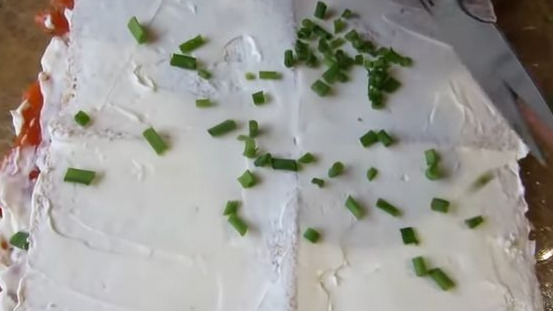 Now lay out a layer of curd cheese and finely chopped green onions.