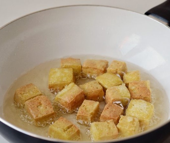 Heat a skillet with oil over medium heat. Fry the tofu in oil until golden brown. Then place the tofu on a paper towel.