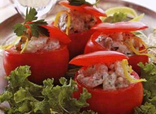 Stuff the tomatoes with shrimps and cover the tomatoes stuffed with the shrimps previously cut off.