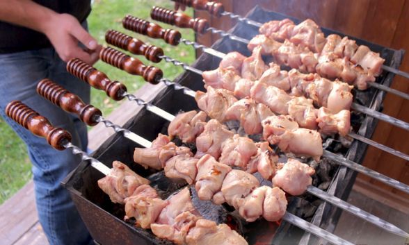 When the kebab is marinated, light the coals in the grill and let them cool slightly. The surest way to understand when the heat will be optimal for cooking kebab is to hold your hand over the barbecue at the height at which the meat will be cooked. If you can hold your hand for 5-6 seconds, then you can safely spread the meat. We string the kebab on skewers and set over the coals. On average, turkey skewers take about 12-15 minutes to cook. When frying, the kebab must be constantly rotated. Due to the abundance of sugars in the marinade, a crust forms on the surface of the kebab very quickly. To determine the readiness of the kebab with maximum accuracy, I, as always, used a culinary thermo. I set it to 75 degrees and waited until the meat reached the specified temperature.