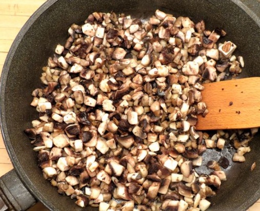 We clean the champignons and refresh the slices on the legs. Cut the mushrooms into small cubes. We spread the mushrooms in a pan with heated vegetable oil (1 tbsp). Fry the mushrooms over medium heat, stirring occasionally, until the liquid has evaporated and cooked (5-10 minutes, depending on the size of the mushroom pieces). Let the mushrooms cool.