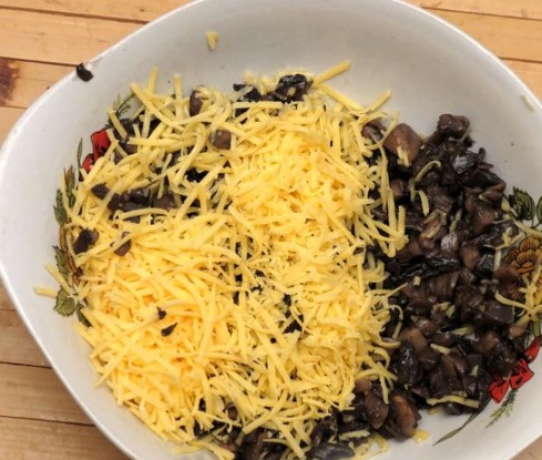 Mix the cooled fried mushrooms with grated cheese. We turn on the oven, let it heat up to 180 degrees.