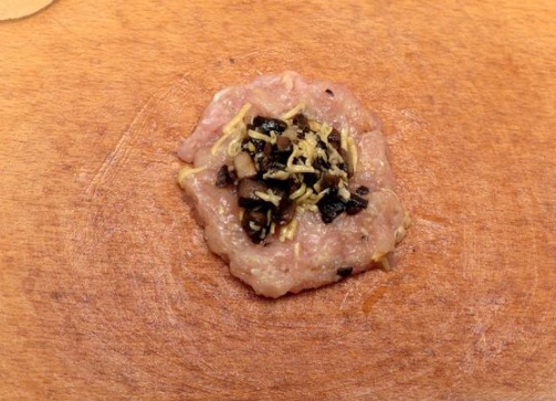 Divide the finished minced meat into 10 equal parts and form cakes. Put 1 tablespoon in the center of the cake. a spoonful of cheese and mushroom filling.